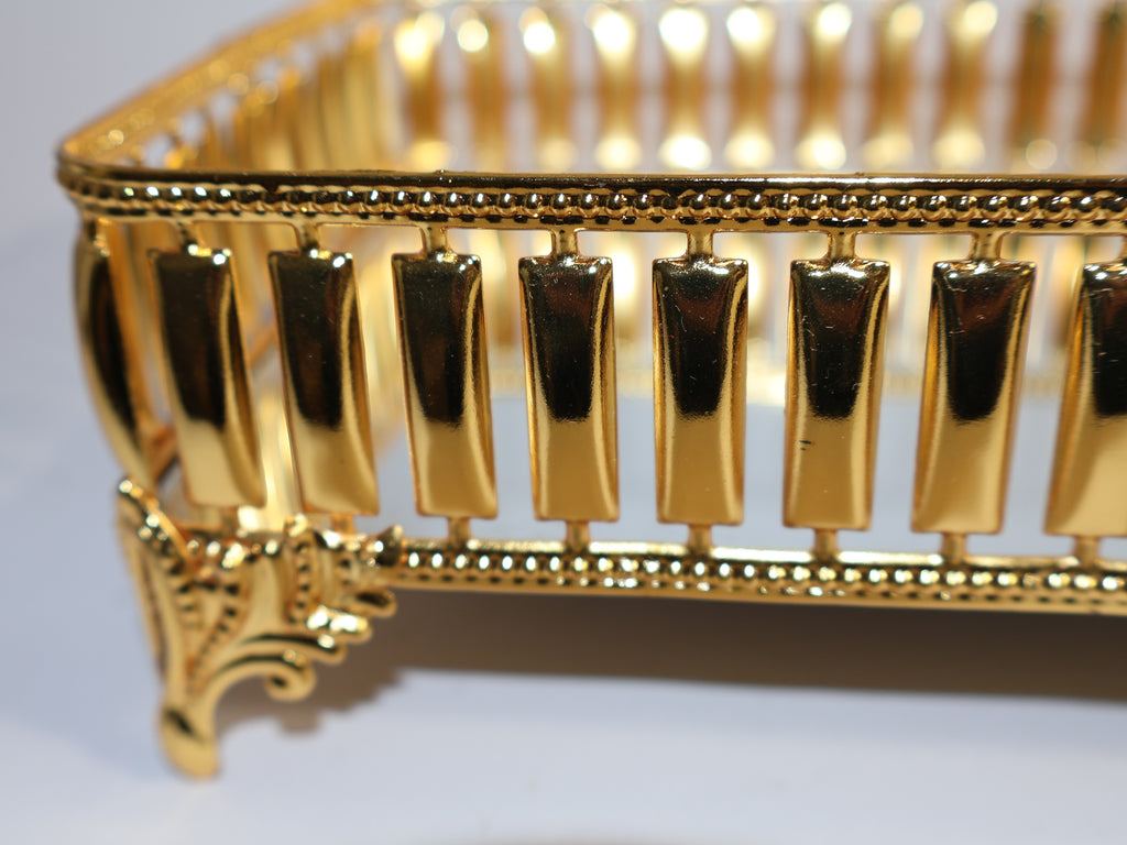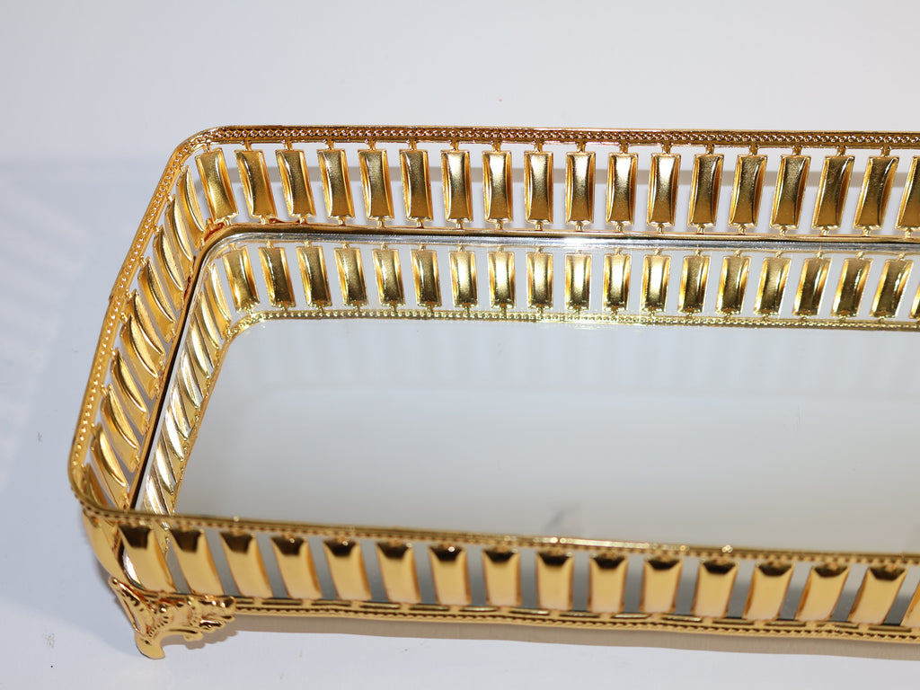 Verleihen Sie Ihrem Zuhause oder besonderen Anlässen einen Hauch von Luxus mit diesem rechteckigen Goldtablett mit Spiegelboden. Perfekt als Dekotablett, Parfümtablett, oder stilvolles Serviertablett eignet es sich hervorragend, um Schmuck, Kosmetik, Kerzen oder Desserts elegant zu präsentieren. Das glänzende Goldfinish in Kombination mit dem hochwertigen Spiegelboden schafft eine atemberaubende Reflexion und verleiht jedem Raum eine exklusive Ausstrahlung.