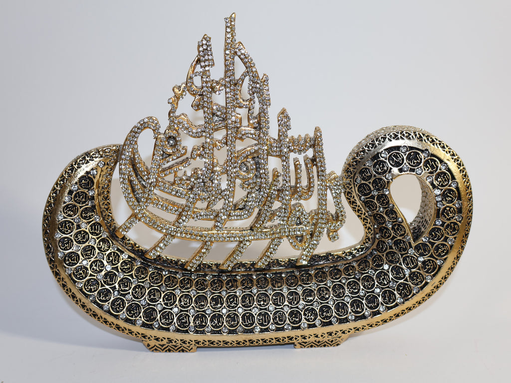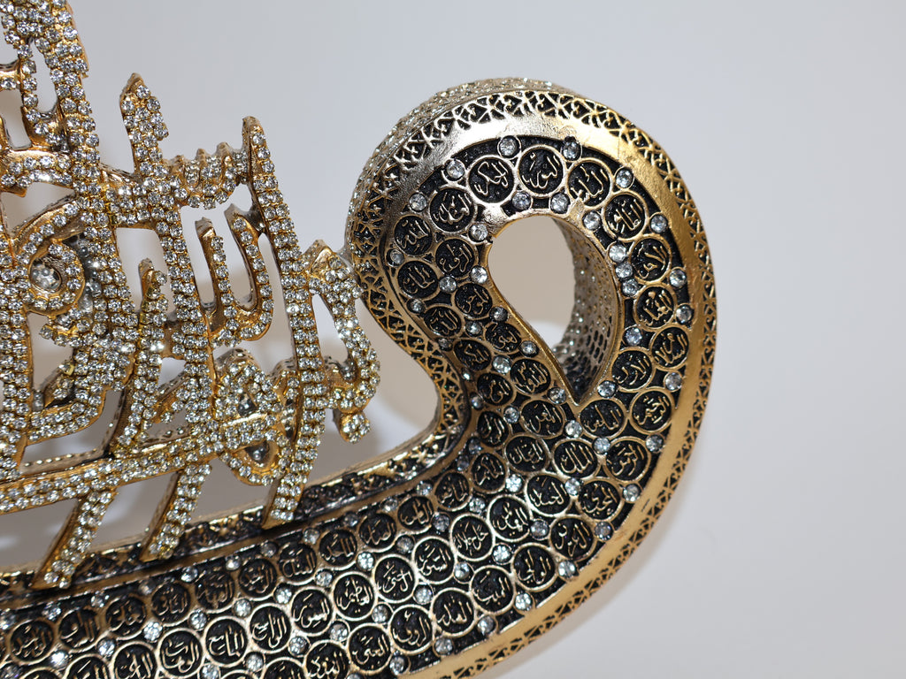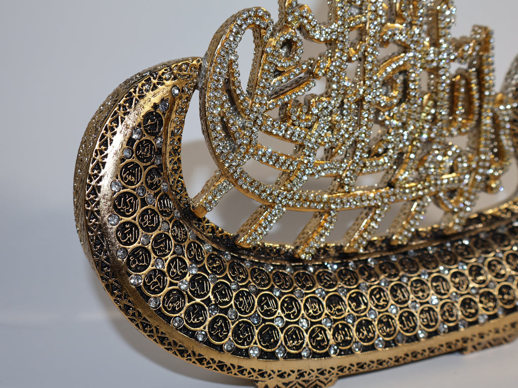 Verleihen Sie Ihrem Zuhause einen edlen und spirituellen Akzent mit dieser luxuriösen islamischen Kalligrafie-Deko. Das prachtvolle Kunstwerk in schimmerndem Gold ist mit funkelnden Strasssteinen verziert, die die arabischen Schriftzüge in einer eleganten Bootsform besonders hervorheben. Die filigranen Details und das edle Design machen dieses Stück zu einem wahren Highlight für Ihre Wohnkultur.